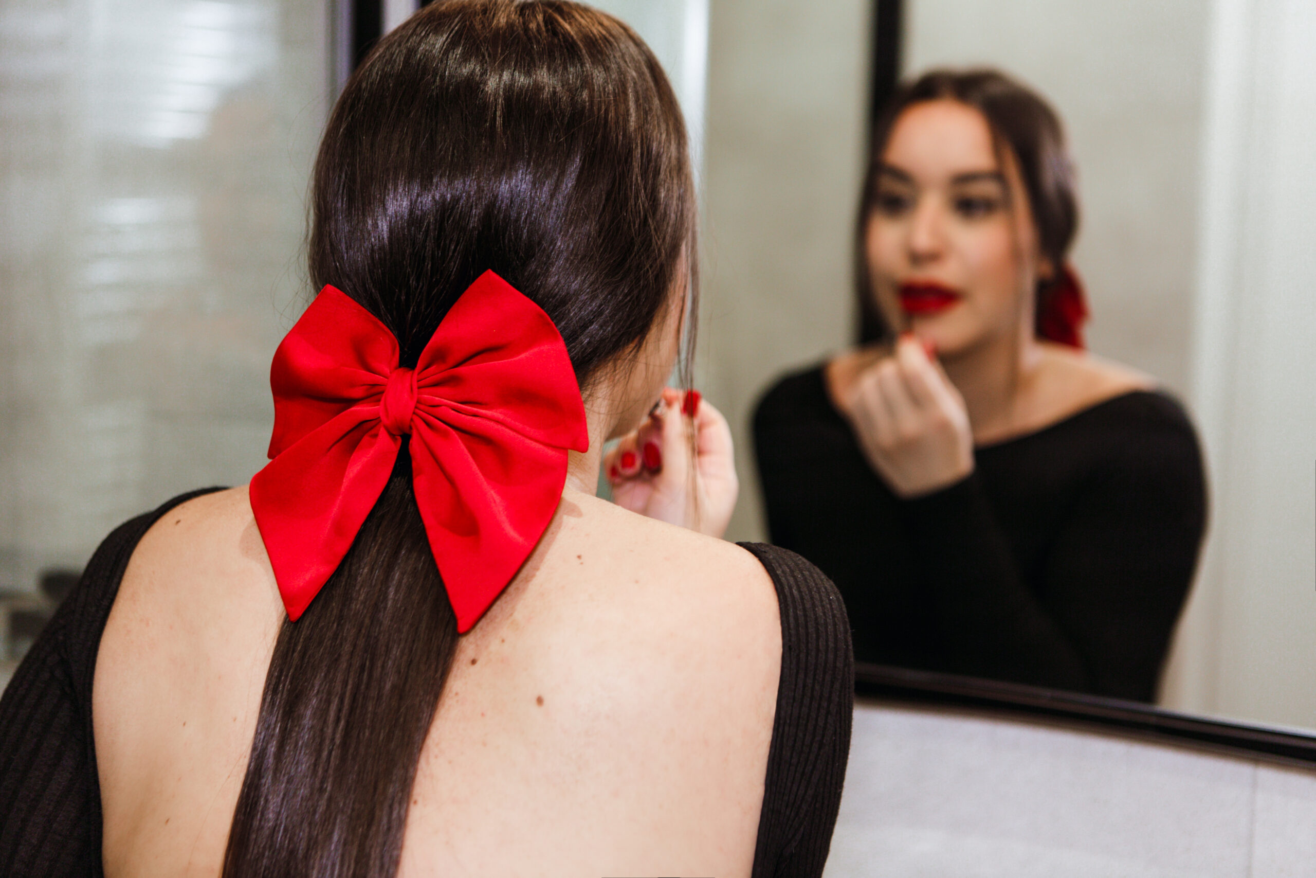 Look de soirée glamour : robe noire ou rouge, bijoux dorés ou argentés, maquillage lumineux.